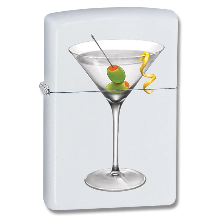 It’s always 5:00 somewhere when you carry the Martini White Matte Zippo Lighter from the Executive Gift Shoppe. This officially licensed lighter has a detailed and colorful graphic of a tasty martini with an olive against a white background. That signature Zippo click will be heard with each light thanks to the flint wheel ignition system and you can add a special personal touch with the engraving of your choice on back of the lighter at no extra charge to you.