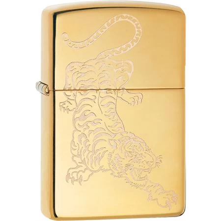 Model/Part Number – ZO09138. Zippo Lighters Tiger Design Lighter. Dimensions: 0.5″ x 2.25″. High Polish Brass. Boxed. Proudly made here in the USA.