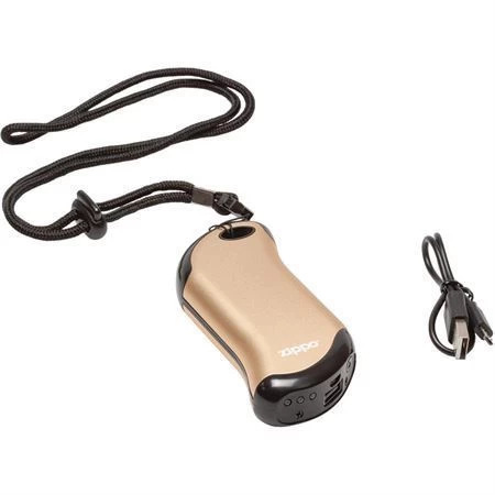 Model – ZO15435. Zippo 15435 – Rechargable Hand Warmer. Dimensions: 4.88″ x 2.38″ x 0.95″. Rechargeable. Hand warmer and power bank. Up to 9 hours of heat. 5200 MAH power lithium-ion battery bank. Charges USB compatible devices. Battery and heat indicator lights. Up to 120F operating temperature. One or two-sided heat output. Six heat settings. Input: 5V2A micro USB. Output: 5V2A USB. Lanyard and charging cord included. Color: Champagne. Boxed with hanging tab. Made in China.