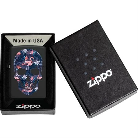 Model/Part Number – ZO71854. Zippo Lighters Flamingo Skull Lighter. Dimensions: 0.5″ x 2.25″. Black Matte. Boxed. Proudly made here in the USA.